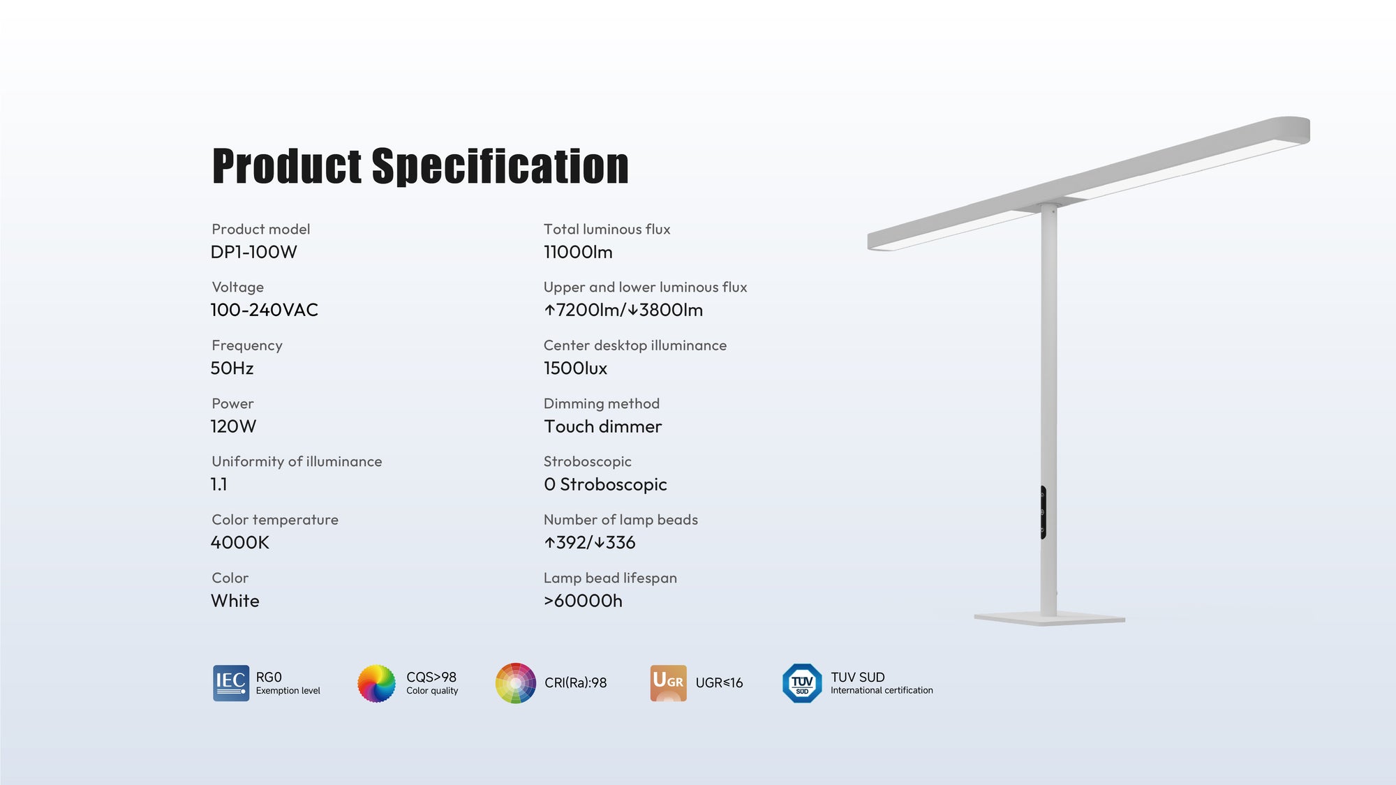 Certified by TÜV SÜD, it is dual-certified for blue light safety (IEC/TR 62778 and IEC/EN 62471) and flicker-free safety (IEEE PAR 1789 and IEC/TR 63158). It provides a comfortable and healthy lighting environment. -