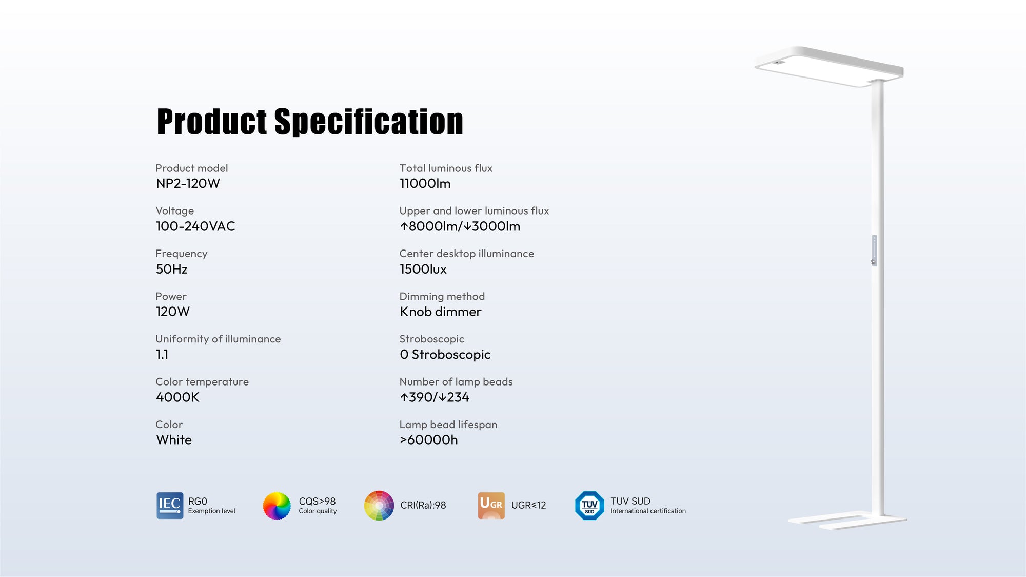 Certified by TÜV SÜD, it is dual-certified for blue light safety (IEC/TR 62778 and IEC/EN 62471) and flicker-free safety (IEEE PAR 1789 and IEC/TR 63158). It provides a comfortable and healthy lighting environment. -